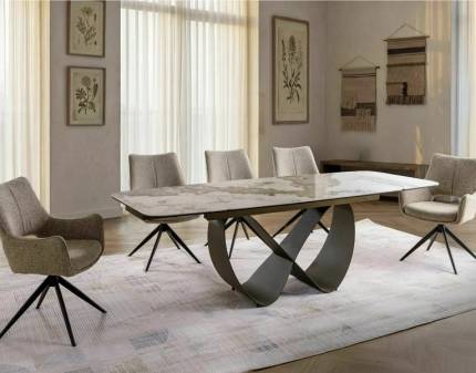 Masa extensibila GENESIS WHITE din ceramica cu efect de marmura alba, MDF cu furnir lemn si metal negru 180-240x90xH75cm