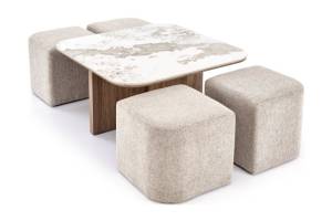Masuta ARAKIS din MDF sinterizat cu efect de marmura bej/ furniruit nuc deschis, cu 4 tabureti tapitati beige 90x90xH45cm