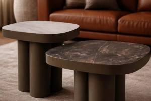 Masuta STELLA B din ceramica Spaniola Vulcano negru lucios, metal cupru 75x75xH43cm
